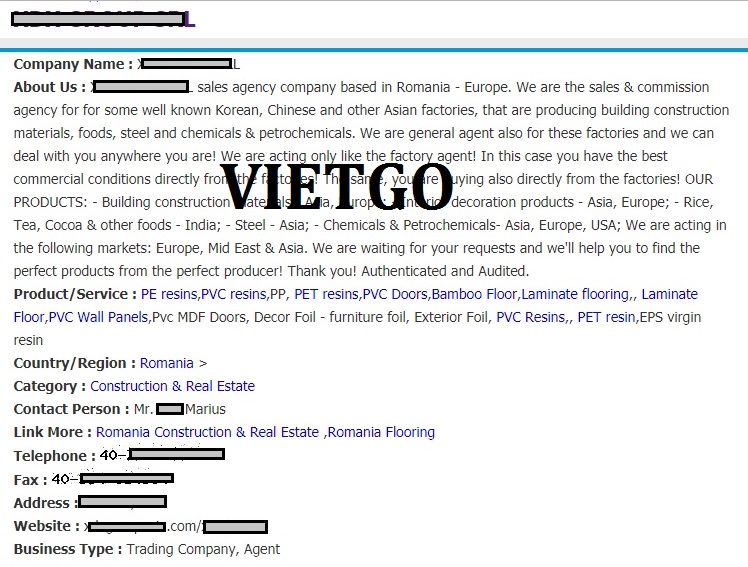 Ông Marius là Giám Đốc Công ty ██████████. Ông cho biết:” Chúng tôi là một công ty thương mại có trụ sở tại Rumani - Châu Âu. Chúng tôi đang kết nối và đại diện cho các nhà sản xuất và phân phối hàng đầu thế giới về các loại sản phẩm từ các khu vực lãnh thổ khác nhau như: - Hóa chất & Hóa dầu, Vật liệu xây dựng, Sản phẩm trang trí nội thất từ Châu Á, Châu Âu; - Gạo, Chè, Ca cao và các loại thực phẩm khác từ Ấn Độ; - Thép từ Châu Á."
