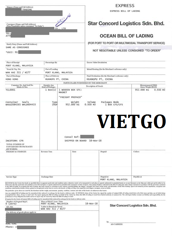Bản B/L xuất khẩu mặt hàng nam châm đến Trung Quốc vào ngày 18/11/2018 của công ty ██████████ TRADING