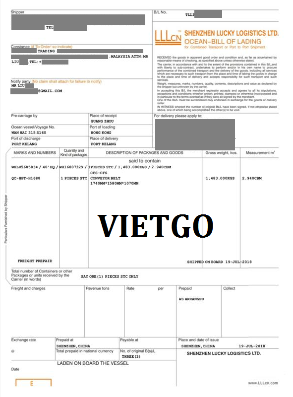 Bản B/L nhập khẩu băng chuyền từ Trung Quốc của công ty ông Liu vào ngày 19/07/2018