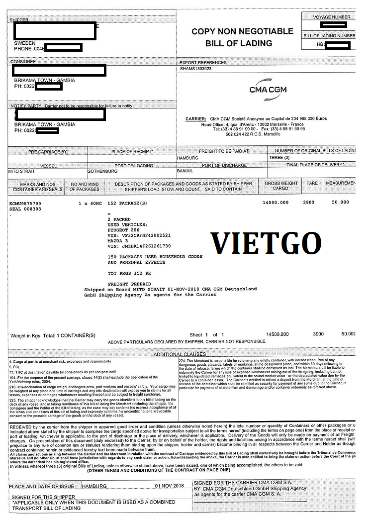 Phương thức báo giá: CNF cảng Banjul, Gambia