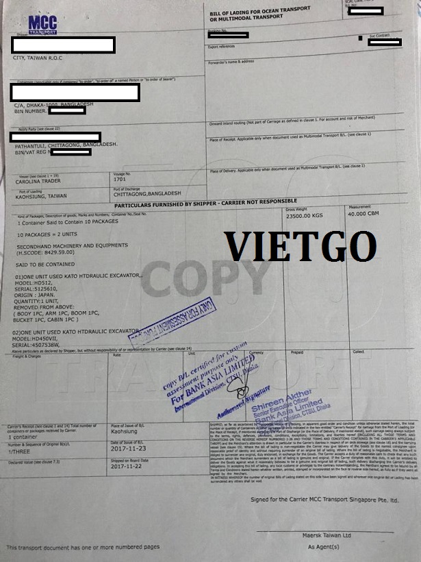 Vận đơn nhập khẩu máy móc thiết bị secondhand ngày 23/11/2017 của Công ty ông Hossen