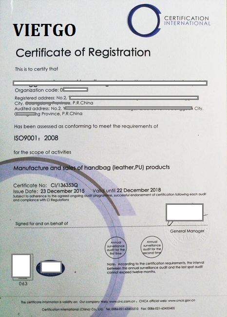 Giấy chứng nhận ISO 9001 của công ty Ông Ryan ngày 23/12/2015