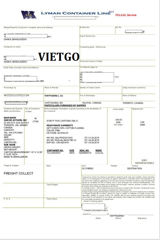 VIETGO cũng xin được gửi tới Quý vị bản Vận đơn nhập khẩu (Bill of Landing) do công ty của Ông Saifuddin tiến hành nhập khẩu với số lượng 1 container 40 HC áo choàng ngày từ Bangladesh để làm minh chứng cho kinh nghiệm trong việc nhập khẩu của vị khách hàng cũng như sự nghiêm túc của Ông trong việc tìm kiếm nhà cung cấp tại Việt Nam cho đơn hàng này.