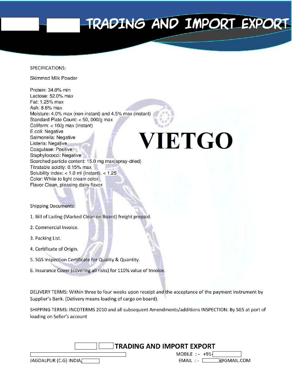 Với cương vị là chủ quản công ty ... ở Ấn Độ, Mr Kumar đã có cuộc trao đổi về nhu cầu nhập khẩu bột sữa bò của mình. Mời quý vị nghiên cứu đơn hàng dưới đây: