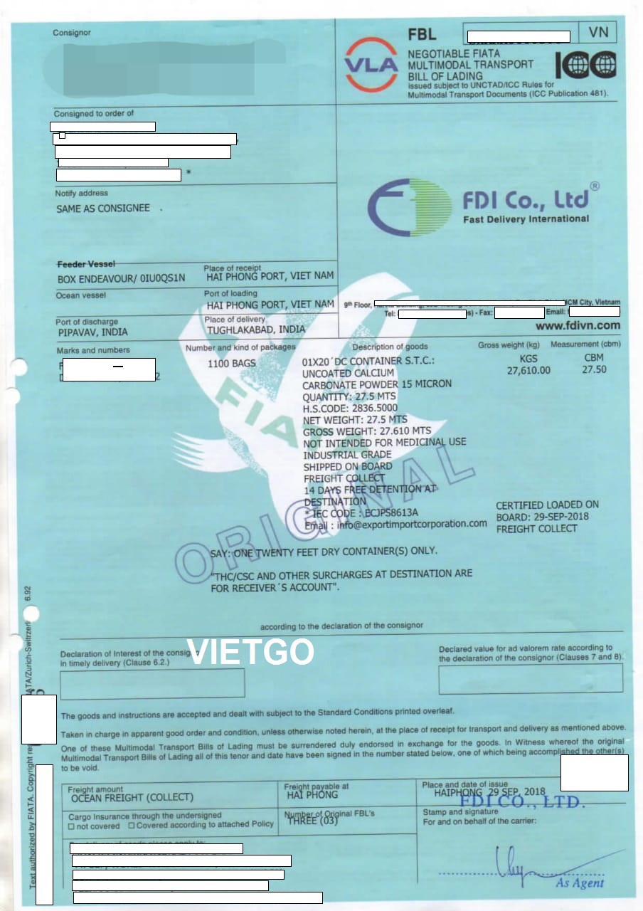 Bản B/L nhập khẩu của công ty ông từ Hải Phòng tháng 11 năm 2018