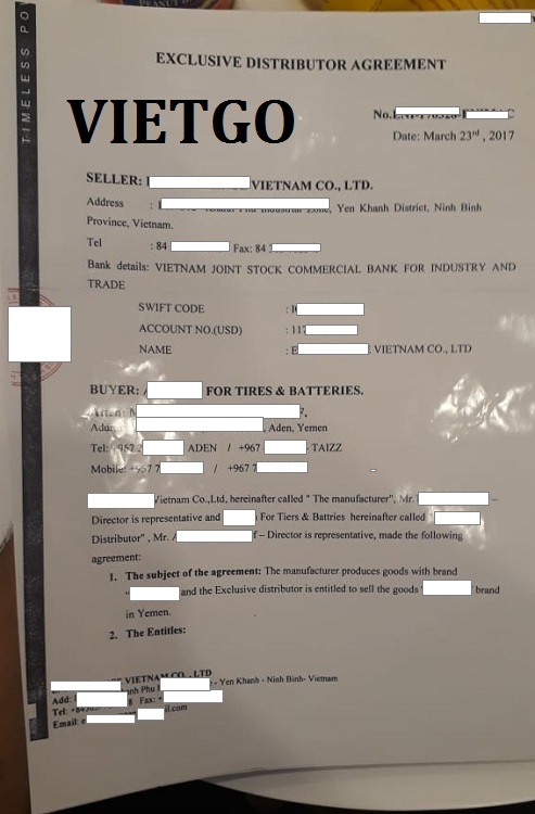 Hình ảnh giấy chứng nhận phân phối độc quyền của một công ty Việt Nam cung cấp sản phẩm lốp xe và Pin của vị khách hàng đến cộng Hòa Yemen