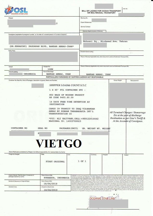 Thông qua VIETGO, vị khách hàng cũng muốn gửi tới Quý vị bản Vận đơn nhập khẩu sản phẩm gỗ của công ty ông ngày 18/06/2019 từ Indonesia để làm minh chứng cho kinh nghiệm giao thương quốc tế của mình: