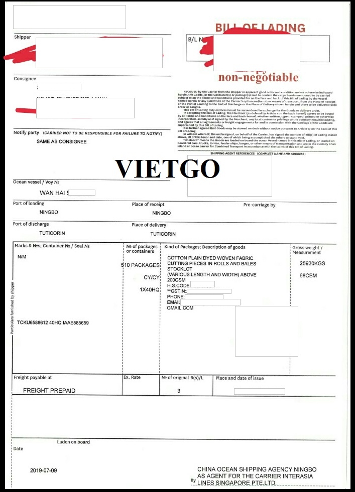 VIETGO cũng xin được gửi tới Quý vị bản Vận đơn nhập khẩu do công ty của Ông Ramar tiến hành nhập khẩu 1 container 40ft vải từ Trung Quốc để làm minh chứng cho kinh nghiệm trong việc nhập khẩu của vị khách hàng cũng như sự nghiêm túc của Ông trong việc tìm kiếm nhà cung cấp tại Việt Nam cho đơn hàng này.