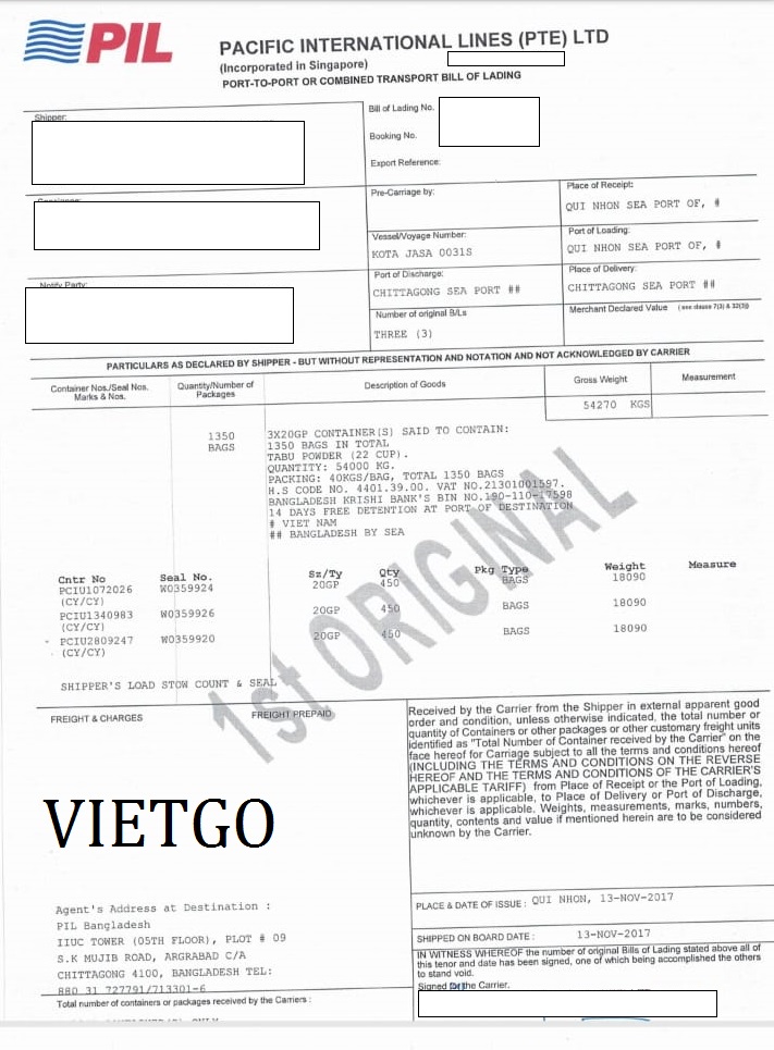 Hình ảnh vận đơn nhập khẩu mặt hàng bột tabu từ Việt Nam