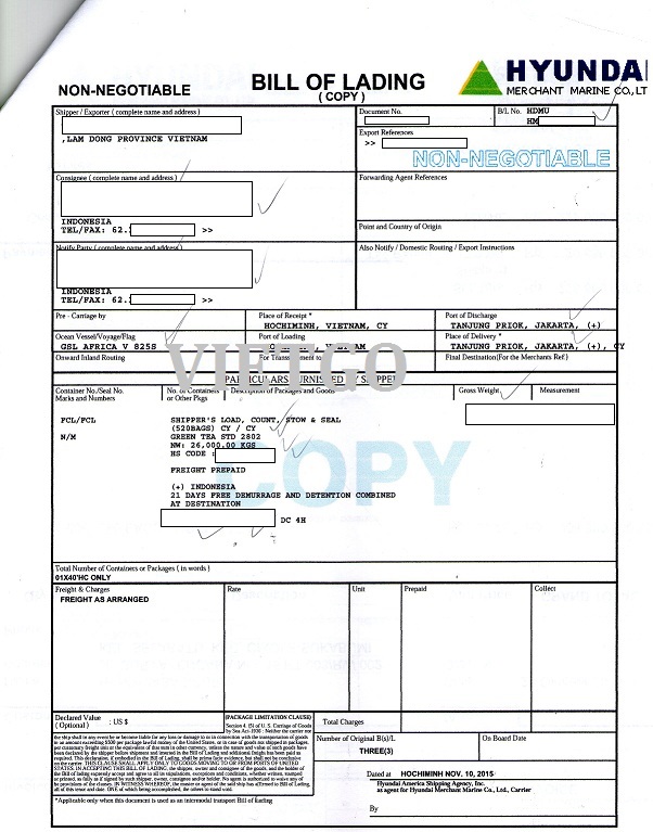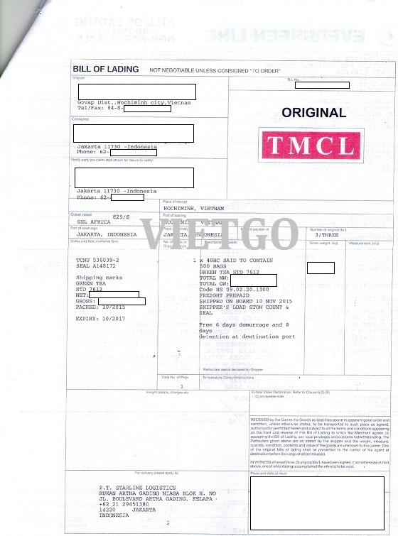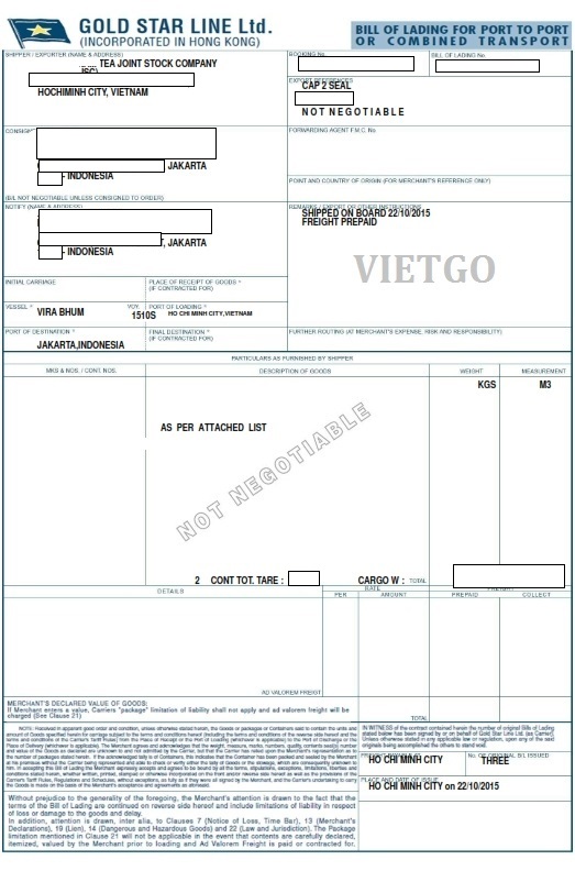 Hình ảnh vận đơn nhập khẩu mặt hàng chè vị khách hàng cung cấp