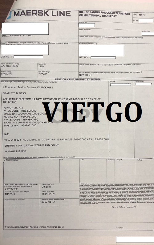 VIETGO xin được gửi tới Quý vị bản vận đơn nhập khẩu khối Graphite ngày 14 tháng 5 năm 2019 từ Trung Quốc để làm minh chứng cho kinh nghiệm trong việc nhập khẩu của vị khách hàng cũng như sự nghiêm túc của Ông trong việc tìm kiếm nhà cung cấp tại Việt Nam cho đơn hàng này.