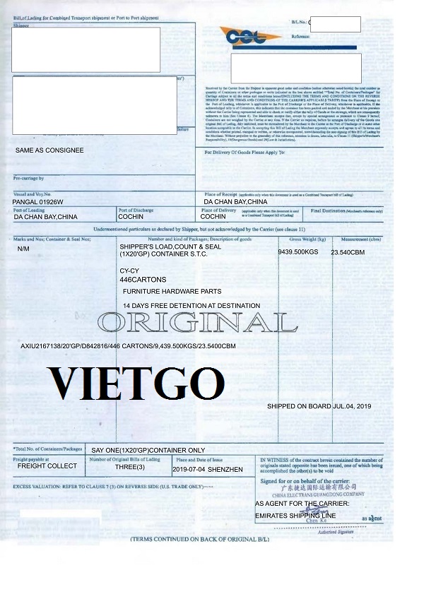 Để Qúy vị có thể tin tưởng ông là vị khách hàng tiềm năng và có kinh nghiệm trong việc nhập khẩu hàng hoá, ông xin được gửi bản vận đơn nhập khẩu mặt hàng nội thất từ Trung Quốc mà công ty ông đã giao dịch vừa qua: