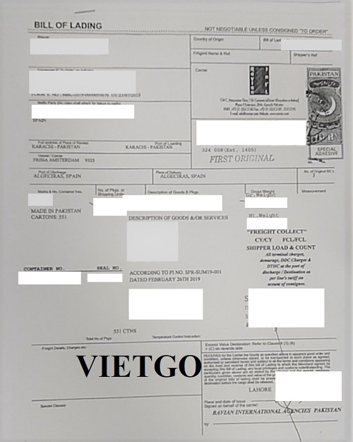 Thông qua VIETGO, vị khách hàng cũng muốn gửi tới Quý vị bản Vận đơn nhập khẩu nguyên phụ liệu may mặc của công ty vào ngày 5/8/2019 từ Pakistan để minh chứng cho kinh nghiệm giao thương quốc tế của công ty: