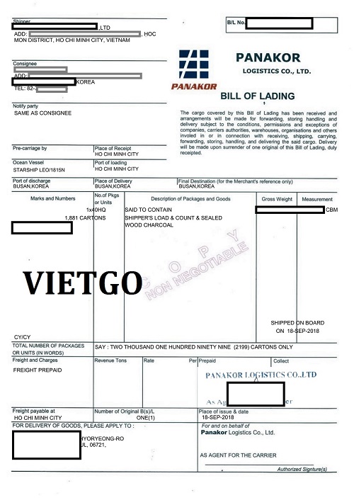 Hình ảnh vận đơn đường biển của công ty ông ngày 18/9/2019 mặt hàng than củi đen