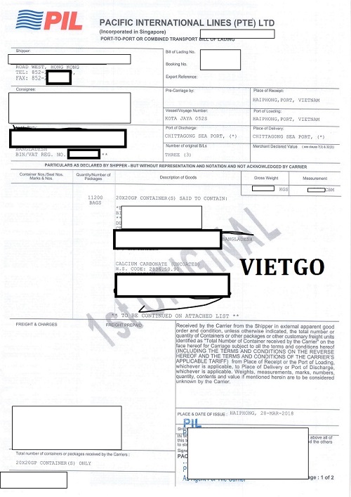 Hình ảnh vận đơn đường biển của công ty ông Taufique ngày 28/3/2018