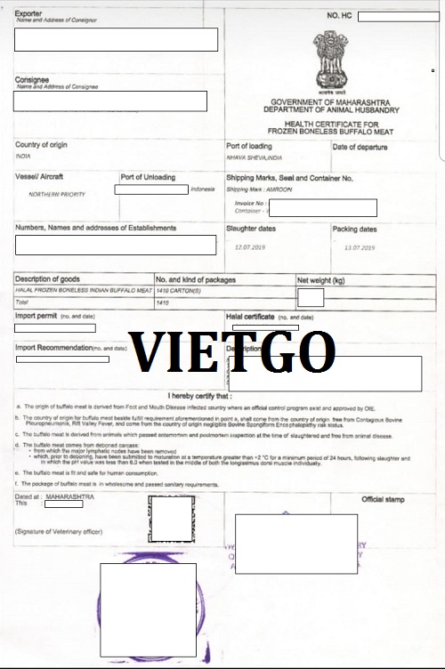 Hình ảnh bản vận đơn nhập khẩu 1410 thùng Thịt Trâu từ Ấn Độ của vị khách hàng