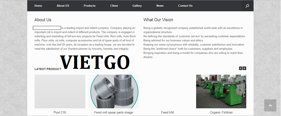 “ ██████████ ██████████ là một công ty nhập khẩu hàng đầu trên thế giới. Đây là Công ty đóng vai trò quan trọng trong nhập khẩu và phân phối các sản phẩm khác nhau. Công ty đang tham gia vào các dự án hỗ trợ cho các nhà máy thức ăn chăn nuôi, nhà máy xay xát, nhà máy gạch tự động, nhà máy bột, nhà máy dầu, phụ kiện máy tính và rất nhiều bộ phận giáo của tất cả các loại máy. Trong 09 năm qua, nó được thành lập như một nhà giao dịch. chúng tôi đã đáp ứng được sự hài lòng của khách hàng đối với chúng tôi bằng sự chân thành, trung thực và liêm chính.”