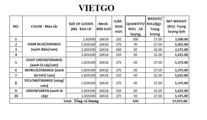 Số lượng: 05 container 20ft FCL hàng tháng, mỗi container 670 cuộn với các yêu cầu chi tiết về màu sắc, kích cỡ, số lượng cụ thể mỗi loại trong bảng khách hàng cung cấp dưới đây