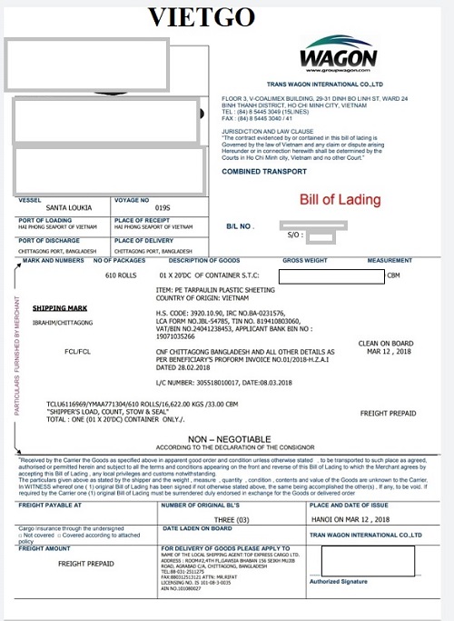 Thông qua VIETGO, vị khách hàng cũng muốn gửi tới Quý nhà cung cấp bản Vận đơn ông đã nhập khẩu mặt hàng bạt nhựa PE từ Việt Nam vào ngày 12/03/2018 để làm minh chứng cho kinh nghiệm giao thương của mình: