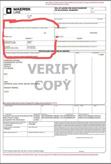 Hình ảnh bản vận đơn nhập khẩu 1container 20ft đồ bảo hộ lao động từ Trung Quốc sang Papua New Guinea của vị khách hàng chia sẻ cùng VietGo