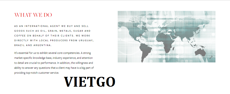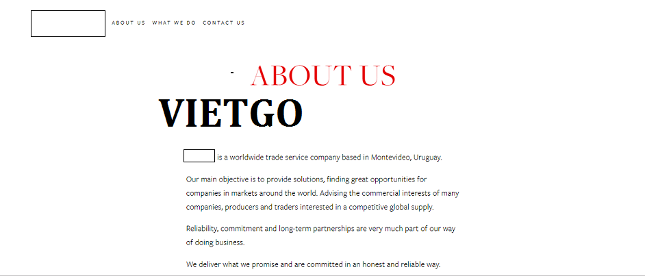 “██████████ là một công ty dịch vụ thương mại trên toàn thế giới có trụ sở tại ██████████, Uruguay. Mục tiêu chính của chúng tôi là cung cấp các giải pháp, tìm kiếm cơ hội lớn cho các công ty tại các thị trường trên thế giới. Tư vấn lợi ích thương mại của nhiều công ty, nhà sản xuất và thương nhân quan tâm đến nguồn cung toàn cầu cạnh tranh. Độ tin cậy, cam kết và quan hệ đối tác lâu dài là một phần trong cách kinh doanh của chúng tôi.