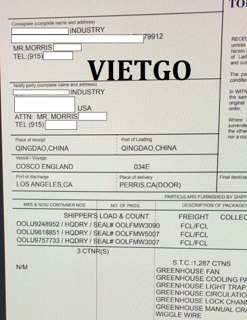 VIETGO xin được gửi tới Quý nhà cung cấp bản Vận đơn nhập khẩu (Bill of Landing) do công ty của Ông Morris tiến hành nhập khẩu một số sản phẩm vật tư từ Trung Quốc để làm minh chứng cho kinh nghiệm trong việc nhập khẩu của vị khách hàng cũng như sự nghiêm túc của Ông trong việc tìm kiếm nhà cung cấp tại Việt Nam cho đơn hàng này.
