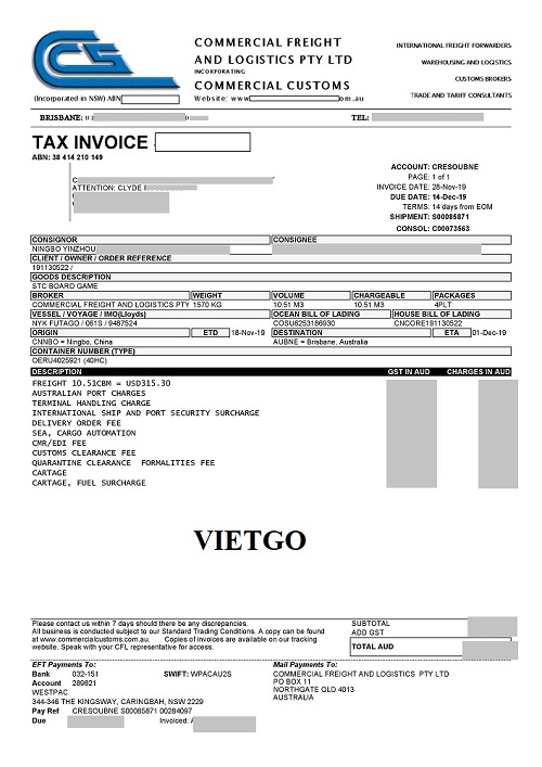 Thông qua VIETGO, ông cũng muốn gửi tới Quý nhà cung cấp Vận đơn nhập khẩu mặt hàng dụng cụ trò chơi cờ bàn - board games vào 18/04/2018 và bản hóa đơn giao dịch phí cước biển cùng mặt hàng này vào ngày 01/12/2019 để minh chứng cho kinh nghiệm giao thương quốc tế của mình: