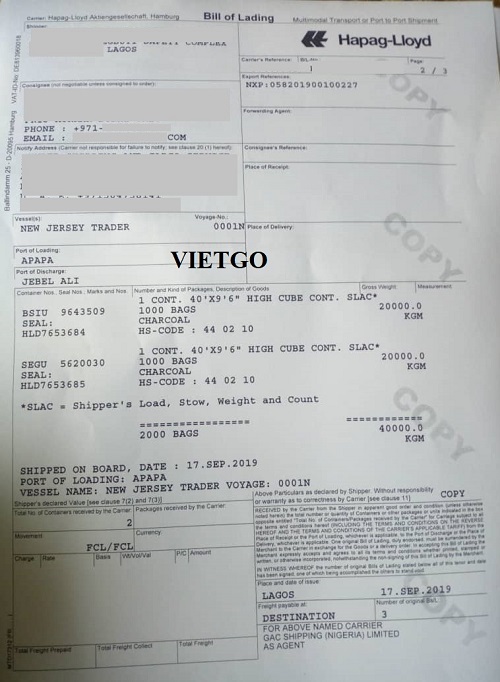 VIETGO cũng xin gửi tới Quý vị bản vận đơn nhập khẩu mặt hàng than khách hàng đã nhập từ Nigeria vào ngày 17/09/2019 để minh chứng cho kinh nghiệm giao thương của vị khách hàng: