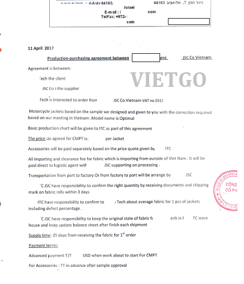 Hình ảnh hợp đồng giao dịch giữa công ty của ông Sokonik và nhà cung cấp do VIETGO xúc tiến