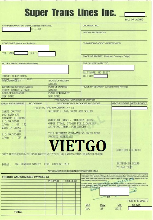 Ông Evan là giám đốc điều hành đến từ ██████████ – là công ty thương mại chuyên cung cấp các sản phẩm về thời trang đặc biệt là giày nam. Những sản phẩm của doanh nghiệp này hiện đang rất được ưa chuộng tại Mỹ và các nước Tây Âu, công ty ông đã 02 lần nhận được chứng nhận ISO9001. Ngoài ra, Công ty Ông rất có kinh nghiệm trong việc nhập khẩu hàng đặc biệt là từ Trung Quốc. Vietgo xin chân trọng kính gửi Quý doanh nghiệp hình ảnh vận đơn nhập khẩu của vị khách hàng vào ngày 28/01/2019 từ Trung Quốc cho mặt hàng giày trẻ em.