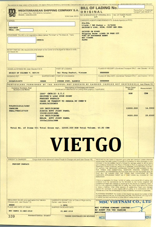 Hình ảnh vận đơn đường biển nhập hai loại gỗ ghép thanh mộng nằm và gỗ xoan ngày 21/5/2019