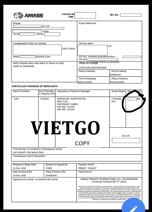 VIETGO xin được gửi tới Quý nhà cung cấp bản vận đơn (Bill of Lading) sản phẩm Sợi ngày 26 tháng 11 năm 2018 mà vị khách hàng đã nhập khẩu từ Trung Quốc đến Mumbai để làm minh chứng cho kinh nghiệm trong việc nhập khẩu của vị khách hàng cũng như sự nghiêm túc của Ông trong việc tìm kiếm nhà cung cấp tại Việt Nam cho đơn hàng này.