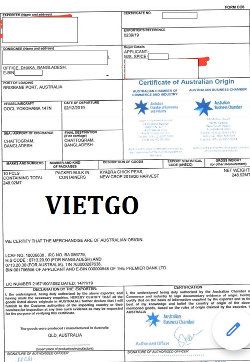 Hình ảnh bản vận đơn nhập khẩu Đậu Gà từ Australia của vị khách hàng chia sẻ cùng VietGo