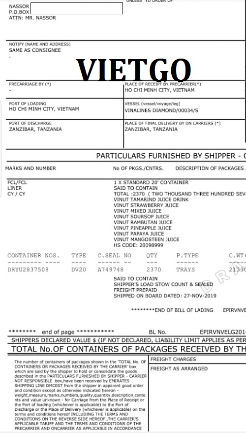 VIETGO cũng xin được gửi tới Quý vị bản Vận đơn nhập khẩu do công ty của Ông Niob tiến hành nhập khẩu Nước Hoa Quả từ Việt Nam để làm minh chứng cho kinh nghiệm trong việc nhập khẩu của vị khách hàng cũng như sự nghiêm túc của Ông trong việc tìm kiếm nhà cung cấp tại Việt Nam cho đơn hàng này.