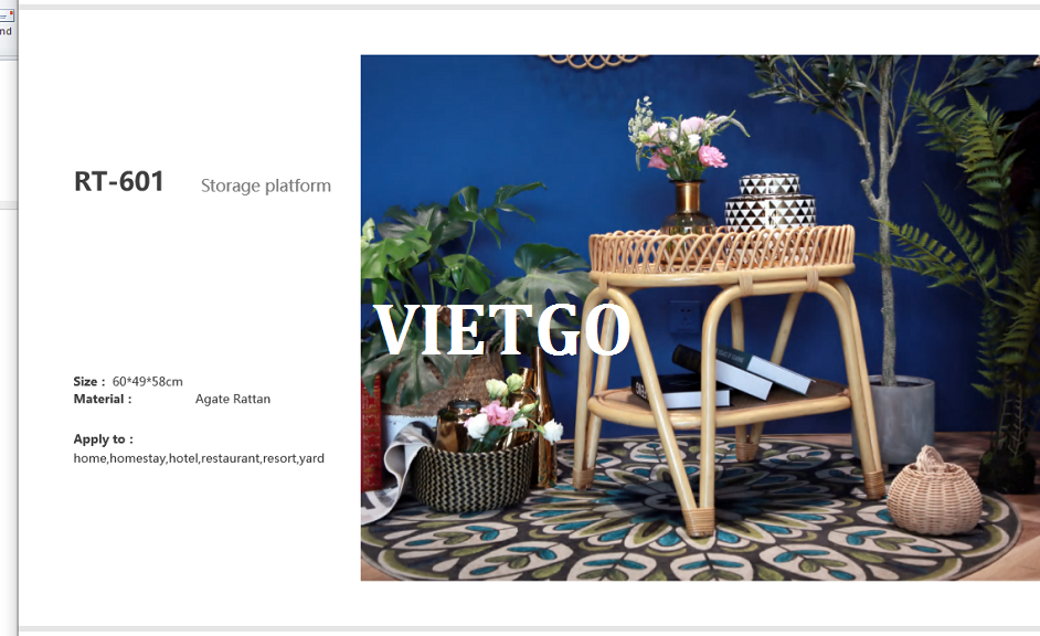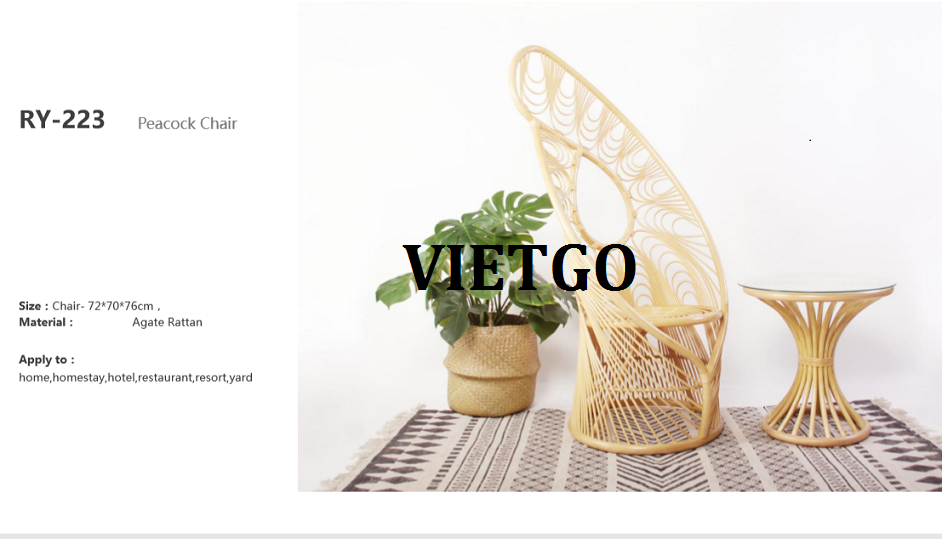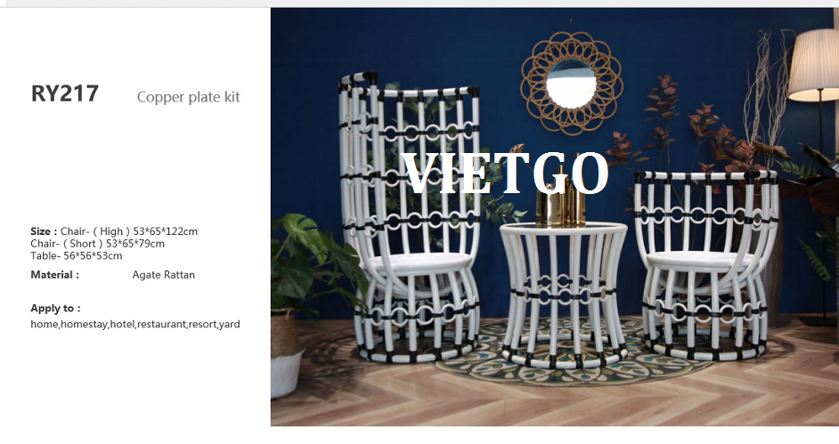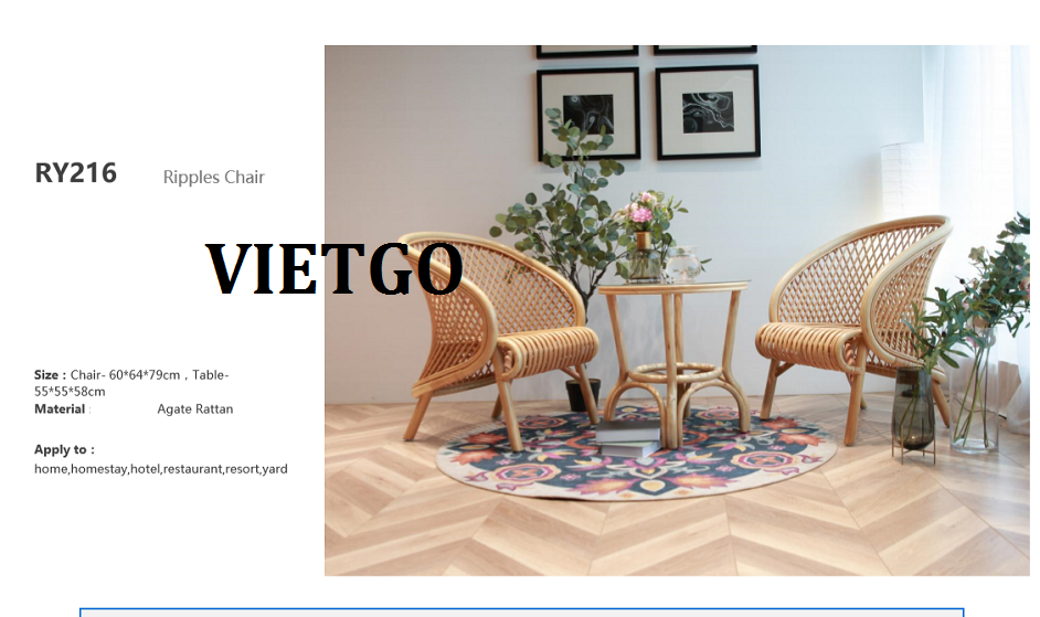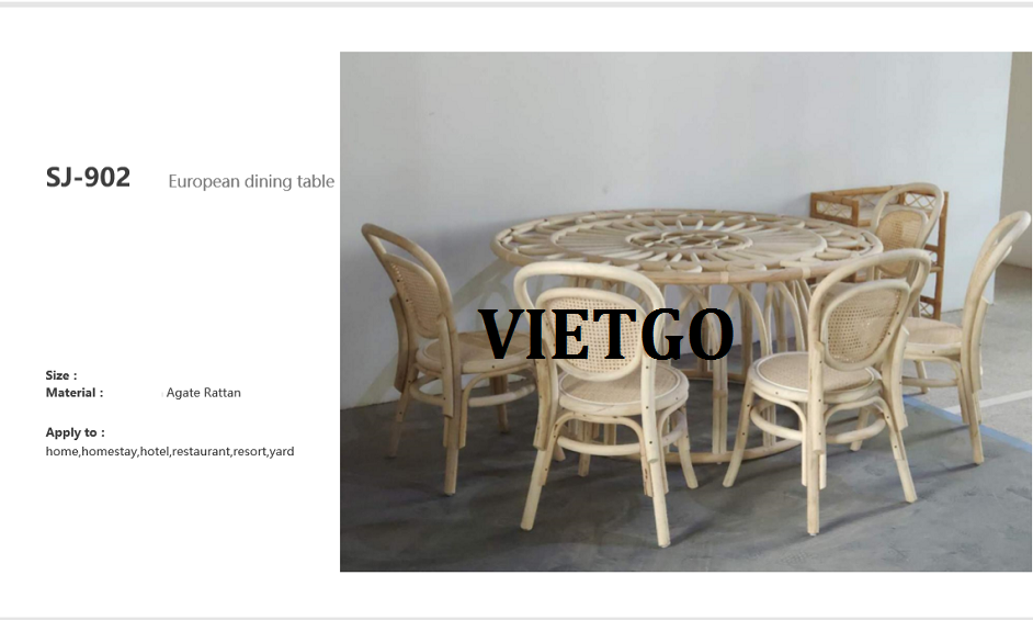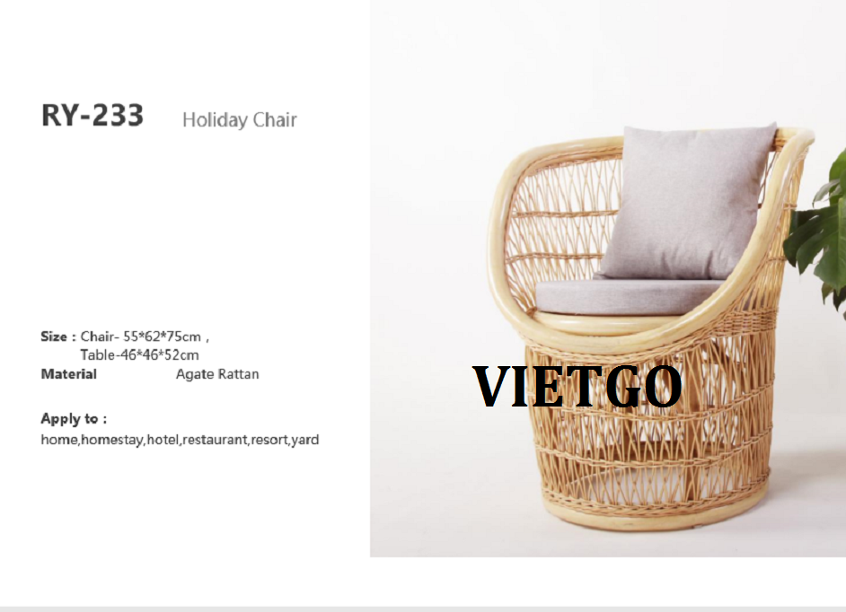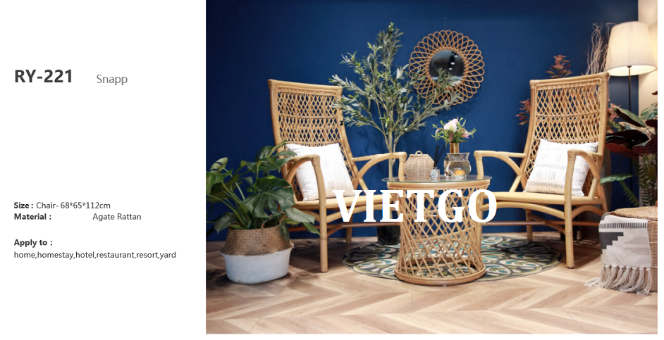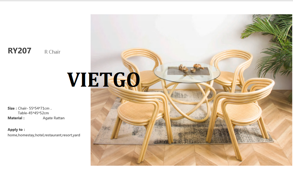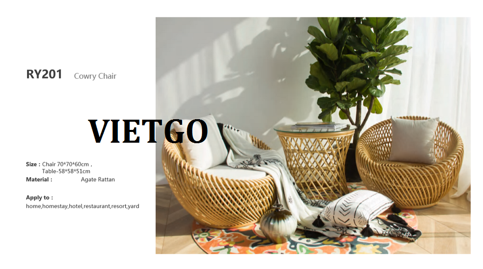 VIETGO xin được gửi tới Qúy vị thông tin về đơn hàng nhập khẩu số lượng lớn Bàn ghế mây đến từ bà Carmela. Vị khách hàng đến từ Úc hy vọng có thể tìm được nhà cung cấp tiềm năng để hợp tác lâu dài.