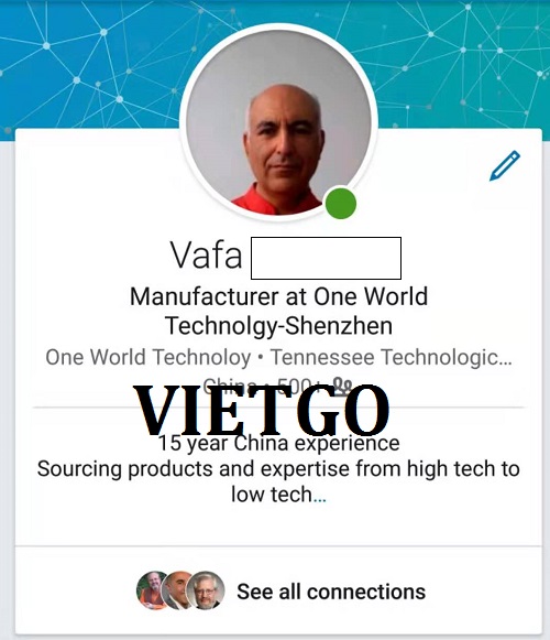 Ông Vafa là vị đại diện đến từ Trung Quốc, ông hiện đang làm đại diện cho một vị khách hàng tại Canada cần nhập khẩu Khẩu Trang, do đó, ông có liên hệ với VIETGO cho đơn hàng khẩu trang vải. Hiện nay, do đại dịch COVID-19 đang diễn ra mạnh mẽ trên toàn cầu, do vậy, vị khách hàng rất muốn nhập khẩu một số lượng lớn khẩu trang để hỗ trợ trong nước và xuất khẩu sang các nước trong khối EU. Liên hệ với VIETGO, ông nhấn mạnh, đây sẽ là đơn hàng lớn, và sẽ nhập khẩu thường xuyên nhất là trong giai đoạn bệnh dịch đang diễn biến khó lường như hiện nay. VIETGO nhận thấy đây là một cơ hội giao thương rất tiềm năng, do vậy, VIETGO xin gửi tới Quý nhà cung cấp thông tin vị khách hàng, kính mong Quý nhà cung cấp hãy sớm liên hệ với ông cho đơn hàng này.