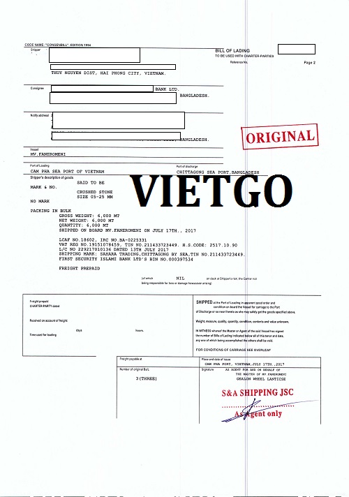 VIETGO cũng xin được gửi tới Qúy vị bản vận đơn nhập khẩu đá xây dựng từ Việt Nam mà công ty ông mới giao dịch vừa qua để Qúy vị có thể tin tưởng ông là vị khách hàng tiềm năng và có nhiều kinh nghiệm trong việc nhập khẩu hàng hóa.