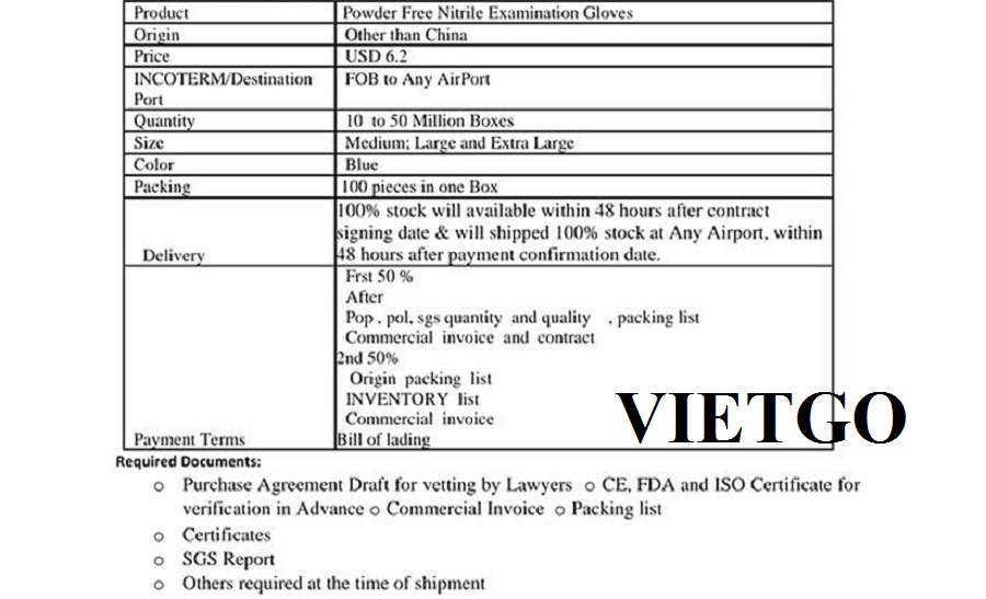 VIETGO xin gửi tới Quý vị thông tin đơn hàng từ ông Naqeeb – vị khách hàng đến từ Mexico với nhu cầu tìm kiếm nguồn cung ứng cho sản phẩm găng tay y tế cho lần nhập thử đầu tiên. Ông Naqeeb rất mong sẽ tìm được đối tác có thể hợp tác lâu dài.