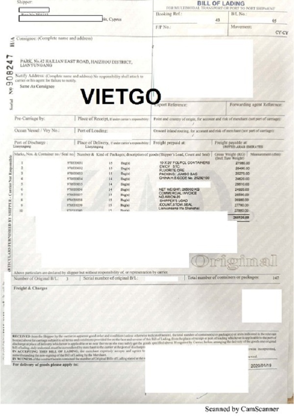 Để củng cố thêm lòng tin cho Quý vị, ông PAPAS đã gửi đến Quý vị một vận đơn (Bill of Lading) của một chuyến hàng nhập khẩu Đá Fluorite thành công từ UAE