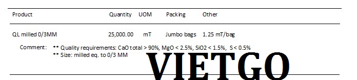 VIETGO xin gửi tới quý nhà cung cấp thông tin đơn hàng nhập khẩu của ông David. Vị khách hàng này hiện có nhu cầu tìm nhà cung cấp vôi bột cho một nhà máy xử lý nước thải và có thiện chí hợp tác lâu dài.