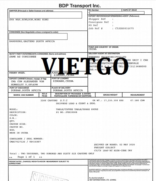 Để củng cố thêm lòng tin cho Quý vị, Ms Lara đã gửi đến Quý vị một vận đơn (Bill of Lading) của một chuyến hàng nhập khẩu bàn cafe mà Công ty bà đã nhập khẩu thành công từ Trung Quốc.
