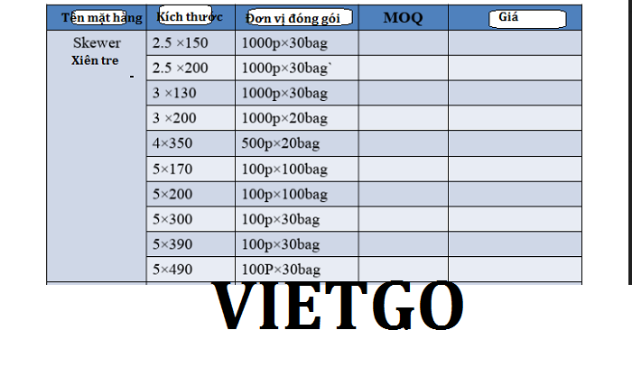 Một doanh nghiệp tại Hàn Quốc hiện đang có nhu cầu tìm đối tác cung cấp mặt hàng xiên tre tại Việt Nam để hợp tác. Dưới đây là thông tin chi tiết về đơn hàng: