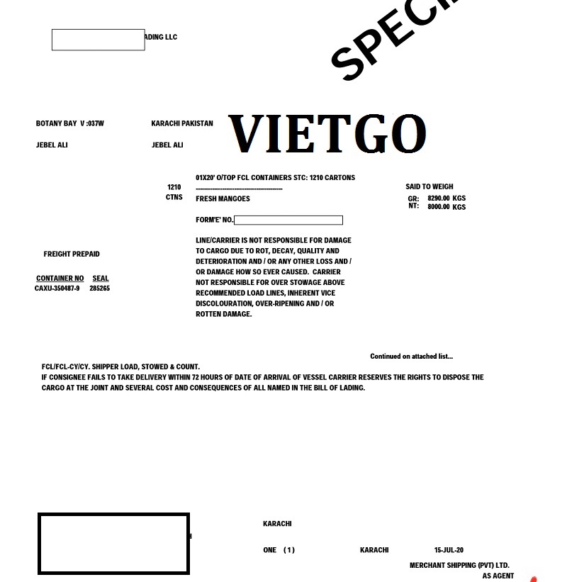 VIETGO cũng xin được gửi tới Quý vị bản Vận đơn nhập khẩu do công ty của Ông Umair tiến hành nhập khẩu Quả Xoài từ Pakistan để làm minh chứng cho kinh nghiệm trong việc nhập khẩu của vị khách hàng cũng như sự nghiêm túc của Ông trong việc tìm kiếm nhà cung cấp tại Việt Nam cho đơn hàng này.