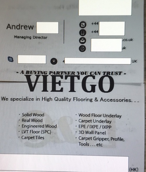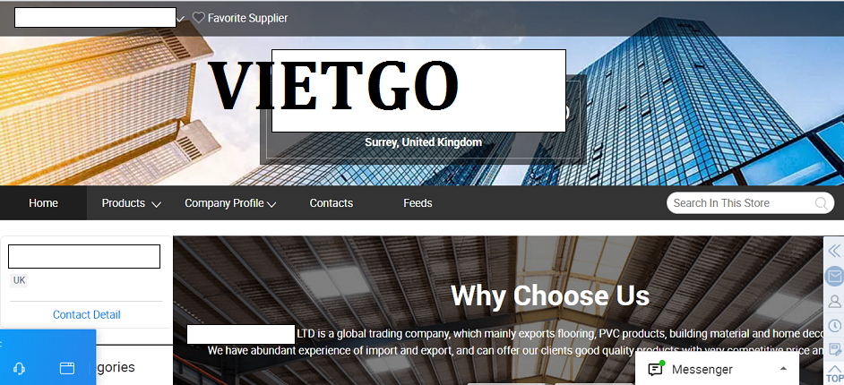 ██████████ là công ty thương mại toàn cầu, chủ yếu xuất khẩu ván sàn, sản phẩm PVC, vật liệu xây dựng và sản phẩm trang trí nhà cửa. Họ có nhiều kinh nghiệm về xuất nhập khẩu, và có thể cung cấp cho khách hàng những sản phẩm chất lượng tốt với giá cả rất cạnh tranh và giao hàng nhanh chóng. Lấy "Dịch vụ khách hàng" làm một trong những giá trị cốt lõi của họ và cam kết cung cấp dịch vụ khách hàng tốt nhất hiện có. Họ đã thiết lập mối quan hệ chặt chẽ với các nhà bán buôn, bán lẻ và cửa hàng bách hoá ở Châu Âu, Mỹ, Úc và Đông Nam Á. Họ có một đội ngũ tìm nguồn cung ứng mạnh mẽ và chuyên môn trong ngành xuất khẩu. Công ty họ đã thiết lập mối quan hệ lâu dài với hơn 100 nhà máy đối tác và có thể cung cấp hàng nghìn mặt hàng.