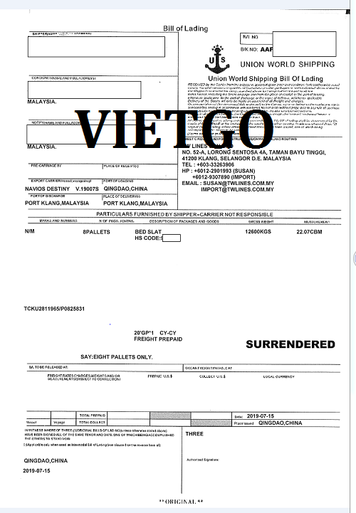 Để củng cố thêm lòng tin cho Quý vị, Ms Catherine đã gửi đến Quý vị một vận đơn (Bill of Lading) của một chuyến hàng nhập khẩu thanh giường mà Công ty bà đã nhập khẩu thành công từ Trung Quốc.