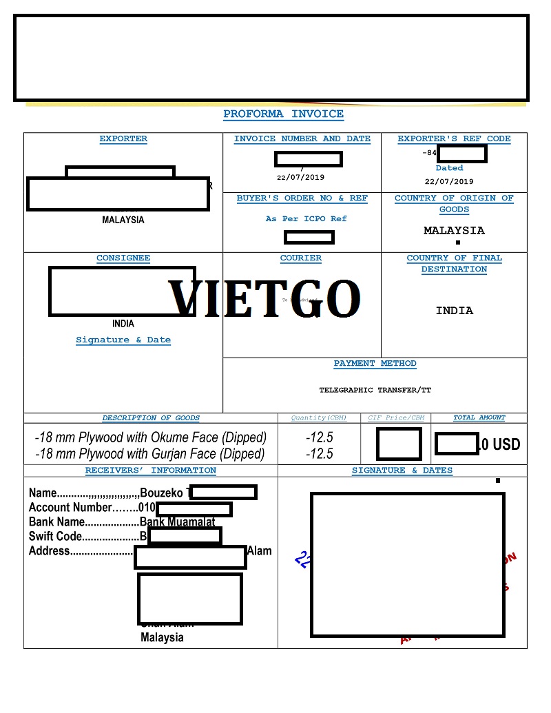 Hình ảnh Hóa đơn chiếu lệ - Proforma Invoice do khách hàng cung cấp.