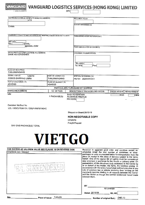 Hình ảnh vận đơn nhập khẩu do vị khách hàng cung cấp