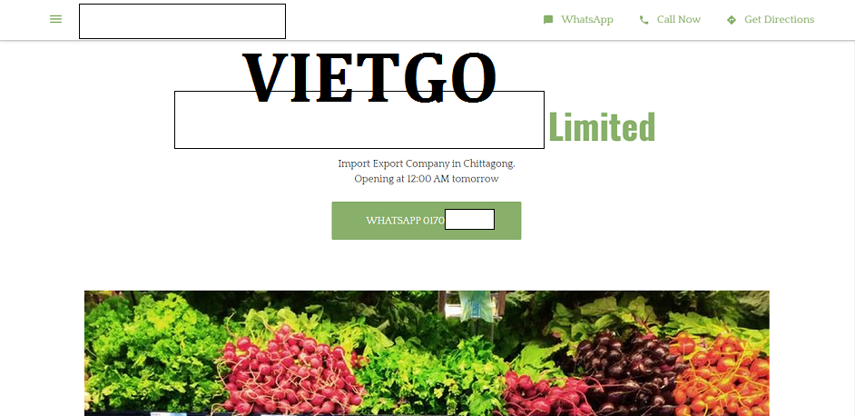 “Chúng tôi tự hào là một đơn vị dẫn đầu trong ngành chế biến và xuất khẩu rau quả tại Bangladesh. Chúng tôi sở hữu các cơ sở canh tác và chế biến với chuỗi cung ứng mạnh mẽ cho phép chúng tôi hỗ trợ và tiếp cận thị trường toàn cầu. Chúng tôi cũng nhập khẩu và chế biến các loại thực phẩm khác nhau - ██████████ ██████████ để đáp ứng nhu cầu thị trường địa phương. Trung Quốc và Ấn Độ là hai quốc gia đối tác quen thuộc của chúng tôi trong một vài năm trở lại đây. Đơn hàng gần đây nhất là container Cà Rốt được nhập khẩu từ Trung Quốc. Đây cũng là lần đầu tiên ██████████ ██████████ ██████████ ██████████ Limited dự định tìm kiếm các đối tác đến từ Việt Nam trong lần hợp tác này. Chúng tôi hy vọng với sự giúp đỡ đến từ Vietgo, chúng tôi sẽ sớm có thể kết nối thành công cùng nhà cung cấp phù hợp và xây dựng được mối quan hệ kinh doanh hợp tác lâu dài với các doanh nghiệp của các bạn.”