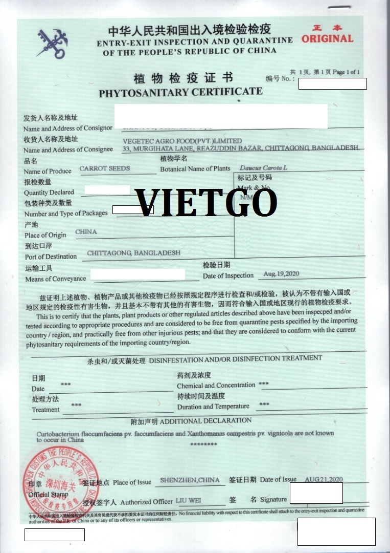 VIETGO cũng xin được gửi tới Quý vị giấy Kiểm Định Thực Vật cho đơn hàng nhập khẩu Cà Rốt từ Trung Quốc do công ty của Ông Azmal tiến hành nhập khẩu để làm minh chứng cho kinh nghiệm trong việc nhập khẩu của vị khách hàng cũng như sự nghiêm túc của Ông trong việc tìm kiếm nhà cung cấp tại Việt Nam cho đơn hàng này.