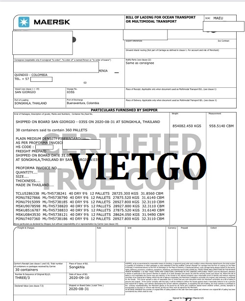 Để củng cố niềm tin cho Quý vị, Ông Duban đã gửi đến Quý vị một Vận đơn BL (Bill of Lading) của một chuyến hàng nhập khẩu thành công Pallet từ Thái Lan.
